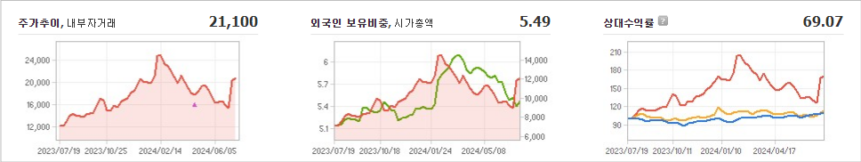 다음은 대웅의 주요 정보입니다: - 주가: 21,100원 (전일 대비 원의 모습) - 대주주: 윤재승(외 13인)이 지분 38.09% 소유 - 시가 총액: 1조2181억 원 - 발행 주식수: 58,141,980주 - 외국인 보유 비중: 5.49% - 장중 거래량: 195,694주 - 매출액: 4,439억 원