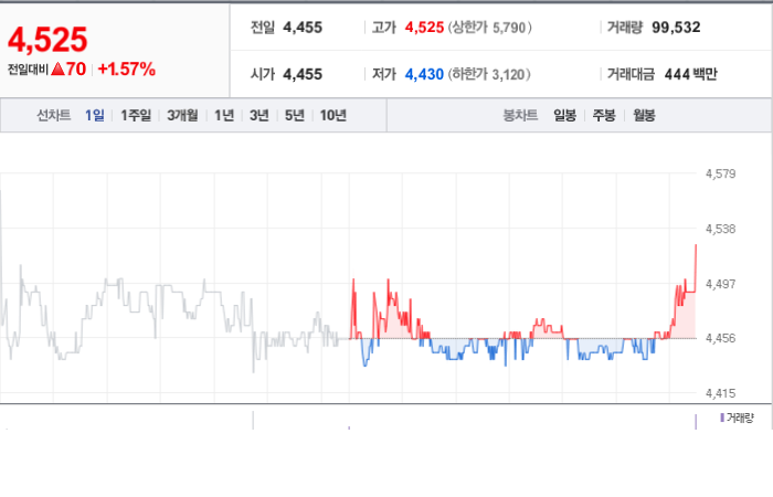 한빛레이저의 현재 주가는 4,525원이며 전일 대비 -17.28원 하락했습니다. 주주 구성을 살펴보면 김정묵(외 25인)이 지분 44.62%를 보유하고 있습니다. 회사는 전자 장비 및 기기 분야에 종사하며 시가 총액은 1041억 원이고 발행 주식수는 22,997,757주입니다. 외국인 보유 비중은 0.21%이며 장중 거래량은 102,375주입니다. 이 회사의 매출액은 32억 원을 기록했습니다.