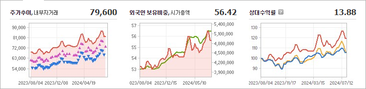 현재 삼성전자의 주가는 79,600원으로, 전날보다 3,500원 하락했습니다. 주주 현황을 살펴보면 삼성생명보험을 포함한 15명이 총 20.08%의 지분을 보유하고 있습니다. 삼성전자는 반도체 및 관련 장비를 다루는 기업으로, 현재 장중 주가는 79,600원입니다. 이 회사의 시가총액은 475조 1,947억 원이며, 총 발행 주식 수는 5,969,782,550주에 달합니다. 외국인 보유 비율은 56.42%로, 장중 거래량은 25,800,275주에 이릅니다. 삼성전자의 매출액은 719,156억 원에 달합니다.