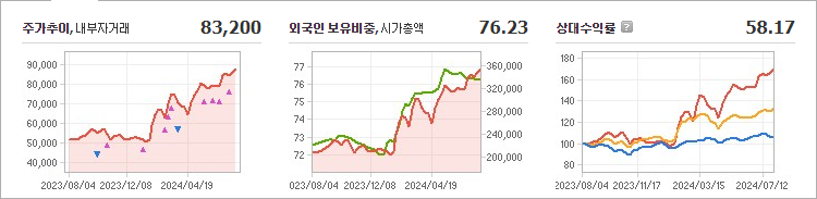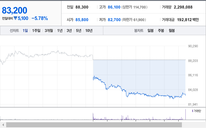 현재 KB금융의 주가는 83,200원으로, 전일 대비 5,100원이 하락한 상태입니다. 주주 현황을 살펴보면 BlackRock Fund Advisors와 그 외 13명이 총 8.26%의 지분을 보유하고 있습니다. KB금융은 상업은행으로, 현재 주가는 장중 기준으로 83,200원입니다. 시가 총액은 33조 5,721억 원이며, 총 발행 주식 수는 403,511,072주입니다. 외국인의 보유 비율은 76.23%이며, 장중 거래량은 2,370,247주에 달했습니다. 매출액은 31,515억 원에 이릅니다.