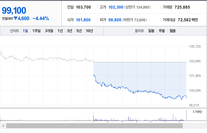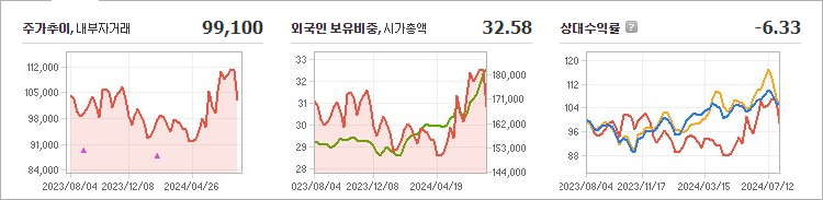 LG전자의 현재 주가는 99,100원으로, 전일 대비 4,600원이 하락했습니다. 주주 현황을 살펴보면 LG(외 2인)이 33.68%의 지분을 보유하고 있습니다. LG전자는 내구소비재 분야의 기업으로, 장중 기준 주가는 99,100원입니다. 시가 총액은 16조 2,175억 원이며, 발행 주식 수는 163,647,814주입니다. 외국인의 보유 비율은 32.58%이며, 장중 거래량은 730,066주에 달했습니다. 회사의 매출액은 210,959억 원에 이릅니다.