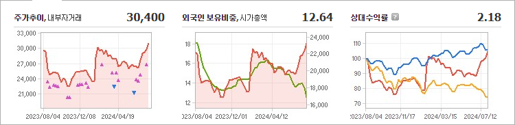 현재 한화의 주가는 30,400원으로, 전날보다 1,050원 하락했습니다. 주주 현황을 보면, 김승연 씨와 그 외 8명이 전체 지분의 48.76%를 보유하고 있습니다. 한화는 복합 산업 기업으로, 현재 주가는 30,400원입니다. 시가 총액은 2조 2,787억 원이며, 발행된 주식 수는 74,958,735주입니다. 외국인의 보유 비율은 12.64%이며, 장중 거래량은 373,769주에 달했습니다. 한화의 매출액은 124,354억 원에 이릅니다.